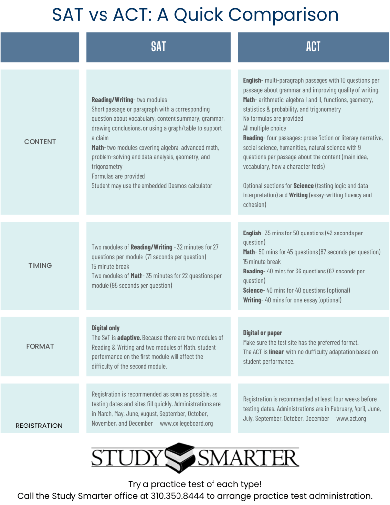 Remember, this is only a surface-level comparison. If you really want to figure out whether you are better suited for the SAT or the ACT, taking practice tests is the best course of action. Call the Study Smarter office to inquire about arranging practice test administrations. Study Smarter test prep tutors have decades of experience helping students master test content, strategy, and confidence.